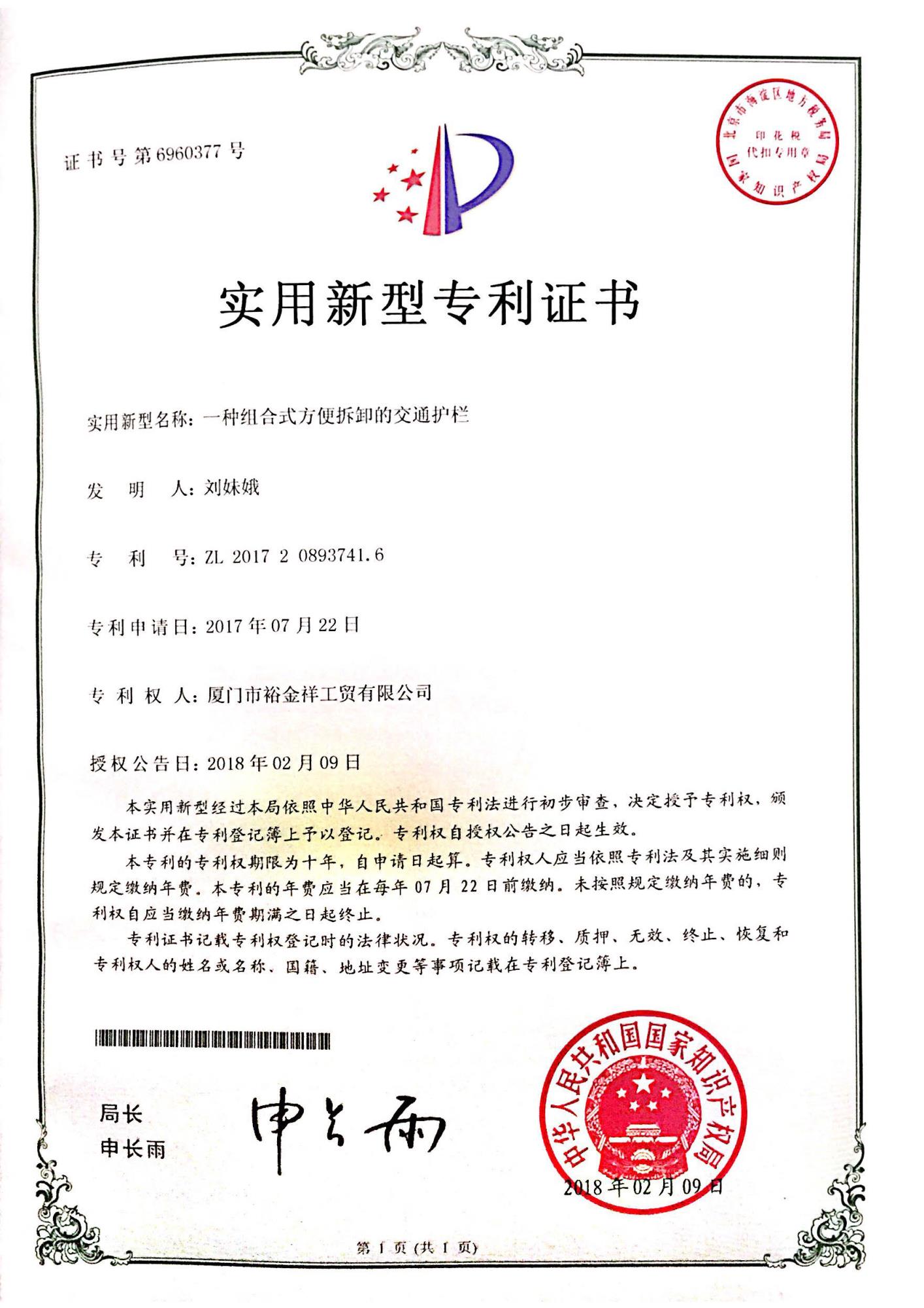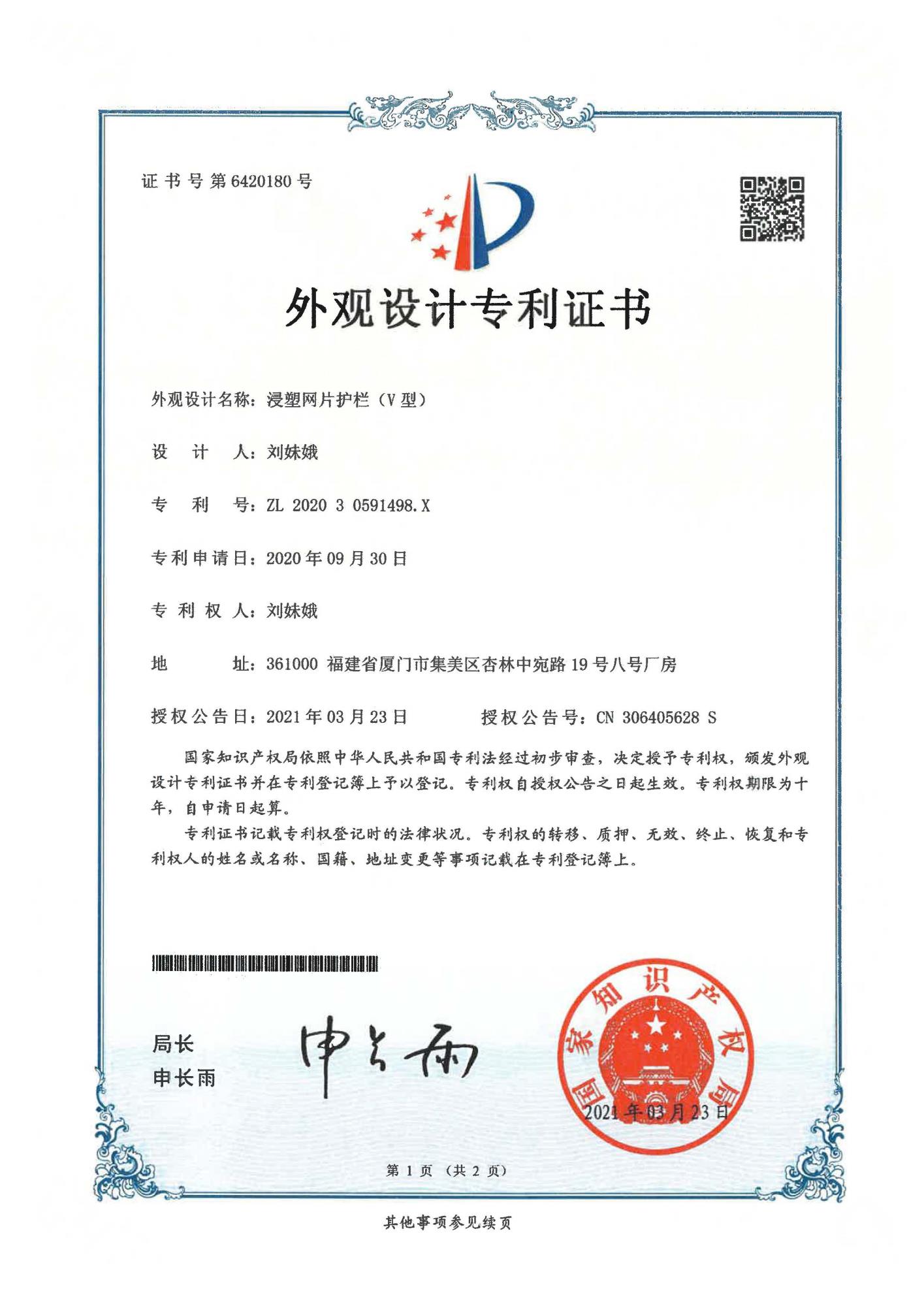 專利證書-浸塑網(wǎng)片護欄V型