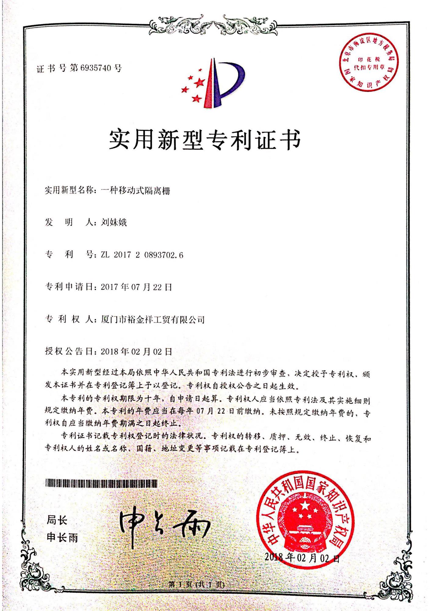 專利證書-移動式隔離柵