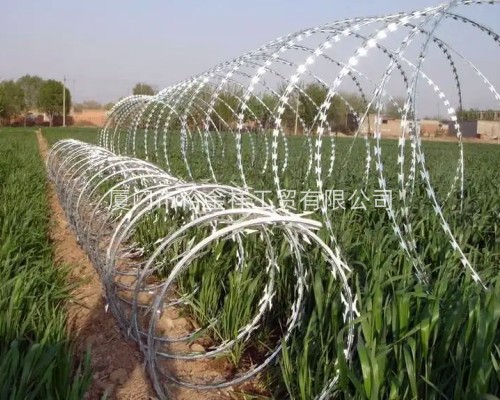 1、刀刺滾籠采用刀片刺繩繞圈后相臨兩圈每隔120度用刺絲連接卡固定,張開后形成蛇腹?fàn)铋]合后刀剌繩圈徑為50cm,張開后每交叉圈安裝間距20cm,直徑不小于45cm。